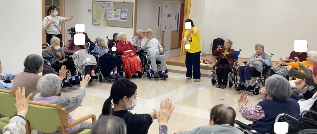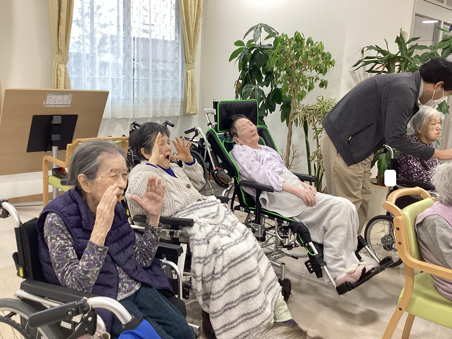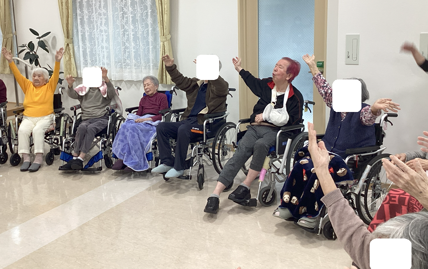 目や耳が聞こえにくい方には職員がフォローを行いつつ、楽しく、元気に体操をしていただきました。